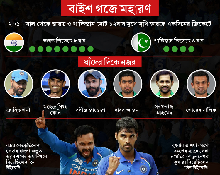 এই ম্যাচের সঙ্গে স্বাভাবিক ভাবেই জড়িয়ে পড়ছে রাজনীতি, আবেগ আর রেষারেষি। এই ম্যাচ মানেই সীমান্তের দুই পাশে জয়ের প্রতীক্ষায় টিভির সামনে বসা। তবে ফর্মের বিচারে ফেভারিট দেখাচ্ছে রোহিত শর্মাদেরই। ভারত এখনও পর্যন্ত প্রতিযোগিতার তিন ম্যাচেই জিতেছে। গ্রুপে হংকং, পাকিস্তানের পর সুপার ফোরের প্রথম ম্যাচে হারিয়েছে বাংলাদেশকে। অন্য দিকে, হংকংকে হারিয়ে শুরু করার পর পাকিস্তান হেরেছে ভারতের বিরুদ্ধে। আর শুক্রবার সুপার ফোরের প্রথম ম্যাচে আফগানিস্তানকে হারালেও জয় এসেছে শেষ ওভারে।