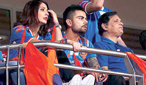 পুণে সিটির কাছে ০-২ হার মাঠে বসে দেখতে হল এফসি গোয়ার অন্যতম মালিক বিরাট কোহলিকে। অনুষ্কা শর্মাকে নিয়ে। ছবি: ইন্দ্রনীল রায়