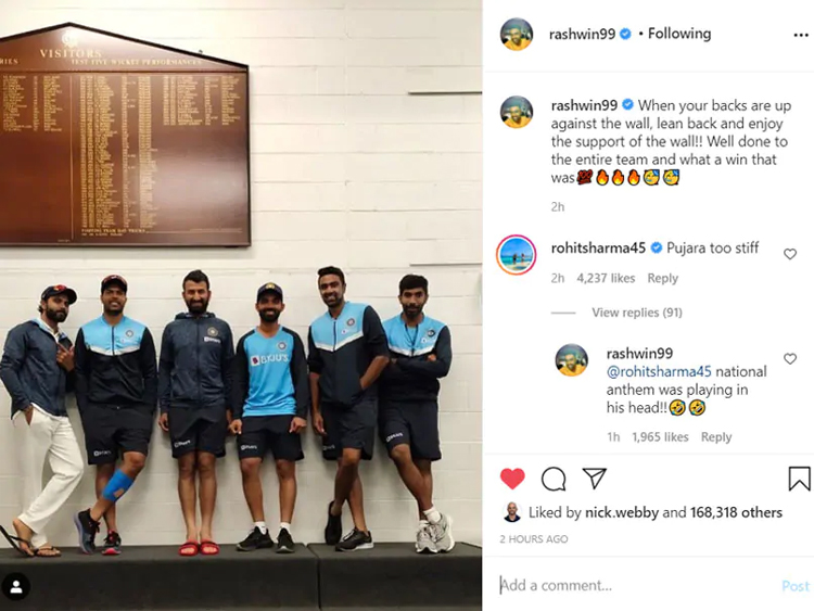 এই ছবি সোশ্যাল মিডিয়ায় আসার সঙ্গে সঙ্গে রোহিত শর্মা লেখেন, ‘‘পুজারাকে খুব কাঠ-কাঠ লাগছে।’’ এরপর অশ্বিনের জবাব, ‘‘বোধ হয় মনে মনে জাতীয় সঙ্গীত গাইছে।’’