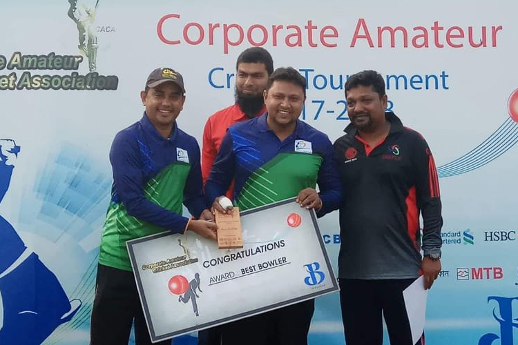 আন্তঃ ব্যাংক প্রতিযোগিতায় এখনও বল হাতে নজর কাড়েন বিকাশ (সামনের তিন জনের মাঝখানে)।