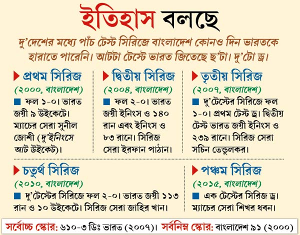 সাম্প্রতিক কালে ভারত কিন্তু পুরোপুরি স্কোয়ার টার্নারে খেলেনি। তাই যুদ্ধটা ভাল ব্যাটিং পিচে হতে পারে। আর বাংলাদেশ ব্যাটসম্যানরা যদি দারুণ ল়ড়াই করতে পারে তা হলে এ রকম কন্ডিশন নিশ্চয়ই উপভোগ করবে। ওরা নিউজিল্যান্ড সিরিজে ভাল ব্যাটিং করেছিল। তবে বাংলাদেশের বড় পরীক্ষা পাঁচ দিন চাপের মুখে টিকে থাকা। নিউজিল্যান্ডে ওরা বড় রান করার ক্ষমতা দেখিয়েছে। ভারতের ব্যাটিং কন্ডিশন ফের সেটা করে দেখানোর জন্য আদর্শ।