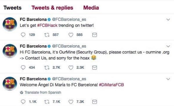 ‘ওয়েলকাম অ্যাঞ্জেল দি মারিয়া’। বার্সেলোনার টুইটারে এই টুইট ভেসে উঠতেই বিশ্ব জুড়ে কানাঘুষো, যাক নেমারের পাল্টা এসে গেল বার্সেলোনায়। এক তো নেমারকে নিয়ে সমস্যার শেষ নেই। যাক সেটা তা হলে মিটতে চলেছে। সঙ্গে প্লেয়ার ট্রান্সফার নিয়ে নতুন নতুন তথ্য। যা দেখে বার্সেলোনা সমর্থকদের চক্ষু চরকগাছ। তলায় তলায় এত কিছু। খবর গেল ক্লাব কর্তৃপক্ষের কাছে। তারাও তাদের টুইটার হ্যান্ডেল দেখে রীতিমতো স্তম্ভিত। ডি মারিয়ার সই নিয়েই গোল বাঁধল সব থেকে বেশি। কিছুক্ষণের মধ্যেই বোঝা গেল হ্যাক হয়েছে বার্সেলোনা ফুটবল ক্লাবের টুইটার অ্যাকাউন্ট।