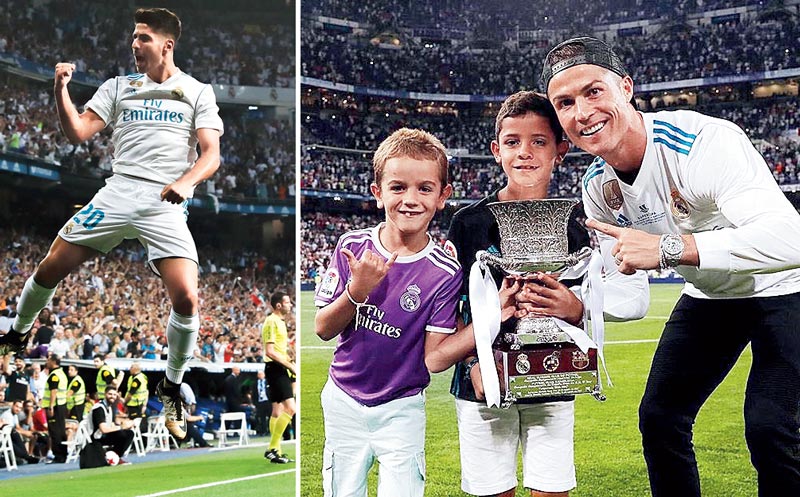 উৎসব: গোল করার পরে অ্যাসেনসিও (বাঁ-দিকে)। ট্রফি নিয়ে ছেলের সঙ্গে রোনাল্ডো। ছবি: গেটি ইমেজেস ও টুইটার