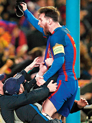 জাদুকরি: নিজেদের মাঠে অবিশ্বাস্য জয়ের রাতে বিরল উৎসব মেসিরও। উঠে পড়লেন ভক্তদের কোলে। ছবি: এএফপি।