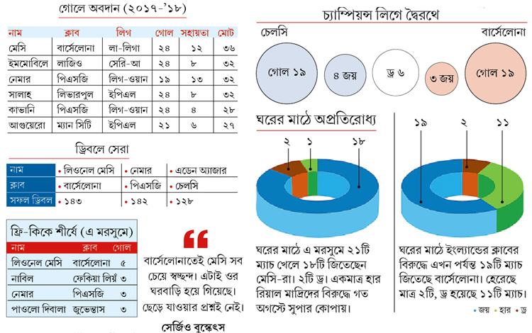 ২০১২-তে ক্যাম্প ন্যু-তে এসে মেসির স্বপ্নভঙ্গ করে দিয়েছিল চেলসি। পেপ গুয়ার্দিওলার দলকে প্রথম লেগে ১-০ হারানোর পরে সে বার ক্যাম্প ন্যু-তে ২-২ করে চেলসি। পেনাল্টি মিস করা মেসির কাছে সেই ম্যাচ দুঃস্বপ্ন। কেঁদেও ফেলেছিলেন তিনি। অতীতের সেই যন্ত্রণার অভিজ্ঞতা এ বার তিনি আরও বেশি করে মুছে ফেলতে চাইবেন। এ বারে দুর্ধর্ষ ফর্মে রয়েছেন আর্জেন্তিনীয় তারকা। লা লিগায় শুধু সর্বোচ্চ গোল স্কোরারই নন, গোলের সহায়তাতেও এক নম্বরে তিনি। ভালভার্দে দারুণ ভাবে ব্যবহার করছেন তাঁকে। সুয়ারেসের সামান্য পিছন থেকে আক্রমণ ভাগে মাঝখানে তাঁকে রাখছেন বার্সা ম্যানেজার। তার ফলে দলের বেশির ভাগ আক্রমণে মেসিই মধ্যমণি থাকছেন।
