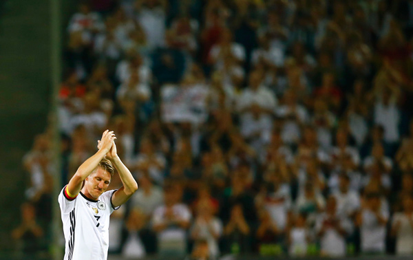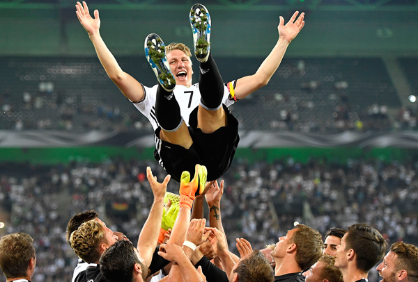 বিদায় জার্মান ফুটবল। শেষ বারের মতো খেলে মাঠ ছাড়ছেন বাস্তিয়ান সোয়াইনস্টাইগার। ছবি: রয়টার্স।