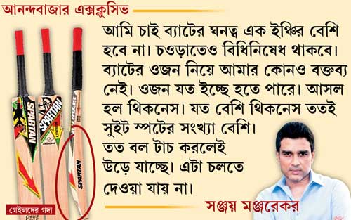 মঞ্জরেকরের দাবি ব্যাট এ বার থেকে দু’ধরনের হবে। এক রকমের ব্যাট আইনসিদ্ধ আর এক রকম নয়। আপাতত ব্যাট মানেই আইনসিদ্ধ তা তার ঘনত্ব তিন ইঞ্চি হলেও। এ দিনই শুনে খুব উৎসাহিত হয়েছেন ব্যারি রিচার্ডসের মন্তব্য। রিচার্ডস বলেছেন, সবাই বলে চামড়া তুলে বোলার অন্যায় সুবিধে নিচ্ছে। বল ট্যাম্পারিং হচ্ছে। এখন যেটা হচ্ছে তা হলে সেটা নিয়ে কেন আওয়াজ তোলা হবে না? ওটা বল ট্যাম্পারিং হলে এটা তো পরিষ্কার ব্যাট-ট্যাম্পারিং।