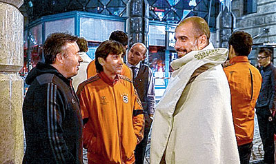 প্রচণ্ড ঠান্ডা, তবু রবেন-গুয়ার্দিওলাদের চাদর মুড়ি দিয়ে দাঁড়িয়ে থাকতে হল মস্কোর হোটেলের বাইরে। ছবি ফেসবুক