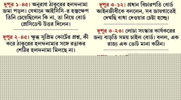 বিচারপতি টিএস ঠাকুরের কাছে বোর্ডকে বলতে হবে, কত দিনের মধ্যে তারা লোঢা সংস্কার সম্পন্ন করতে পারবে। রায় হয়তো আজ আসেনি, কিন্তু যা খবর চলতি সপ্তাহেই আসতে পারে যে কোনও দিন। পিটিশনার আদিত্য বর্মার মতো কেউ কেউ নয়াদিল্লি থেকে ফোনে বললেন যে, মঙ্গলবার বোর্ডের রিভিউ পিটিশন নিয়ে সিদ্ধান্তের পরেই রায় বেরোতে পারে। এবং সেই রায়ে বর্তমান বোর্ড শীর্ষকর্তাদের ‘গিলোটিনে’ যাওয়ার আশঙ্কা এখনও আছে। কিন্তু এটাও ঠিক, বোর্ড শেষ দু’উইকেট নিয়ে নাটকীয় ভাবে টেস্ট ম্যাচকে পঞ্চম দিনে নিয়ে যেতে পেরেছে। কিছুটা হলেও নরম করতে পেরেছে আদালতকে।