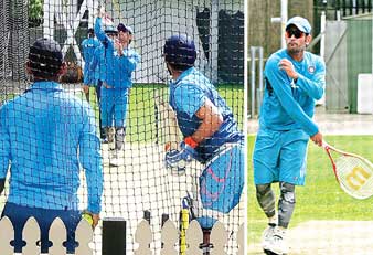 টেনিস র্যাকেট হাতে রায়নাকে শর্ট বল সামলানোর অনুশীলনে ধোনি।