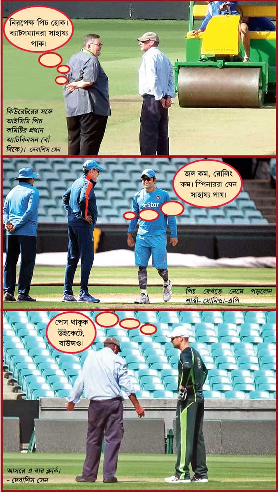 আর তাতে সিডনি সেমিফাইনালের কিছু যায় আসে না! তার যে সব অনু-পরমাণু শিরা আর ধমনীতে ছড়িয়ে পড়ার কথা ছিল, তা ঠিকই ছড়িয়ে পড়েছে! প্রবাদপ্রতিম তিন ব্যাটসম্যানের অনুপস্থিতি তার সম্মানকে অগ্রাহ্য করার পক্ষে যথেষ্ট নয়। মাদকতার আঙ্গিকে এমনই তার অবস্থান! সোমবার যেমন! কথা নেই, বার্তা নেই বাহাত্তর ঘণ্টা আগেই দু’পক্ষে নীরব টেনশন শুরু হয়ে গেল আর তাতে তৃতীয় পক্ষ হিসেবে জড়িয়ে পড়ল সর্বময় কর্তৃত্বসম্পন্ন আইসিসি। পটভূমি এ রকম: সকালে সিডনি মাঠের বহু আলোচিত পিচের পাশে হঠাত্ই গিয়ে হাজির হন আইসিসির পিচ কমিটির সর্বেসর্বা অ্যান্ডি অ্যাটকিনসন। তিনি কথা বলতে থাকেন এসসিজি মাঠের সহকারী পিচ প্রস্তুতকারকের সঙ্গে। তখনও পিচ প্রস্তুতকারী টম পার্কার এসে পৌঁছননি। পার্কার এসে পৌঁছতে অ্যাটকিনসনের সঙ্গে তাঁর দীর্ঘ আলোচনা শুরু হয়।