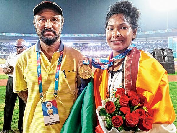 কোচের সঙ্গে হেপ্টাথলনের সোনাজয়ী স্বপ্না বর্মন। নিজস্ব চিত্র
