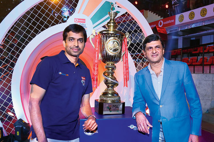 মহাতারকা: পিবিএল ফাইনাল শুরুর আগে দুই কিংবদন্তি। পুল্লেলা গোপীচন্দ এবং প্রকাশ পাড়ুকোন। পিবিএল