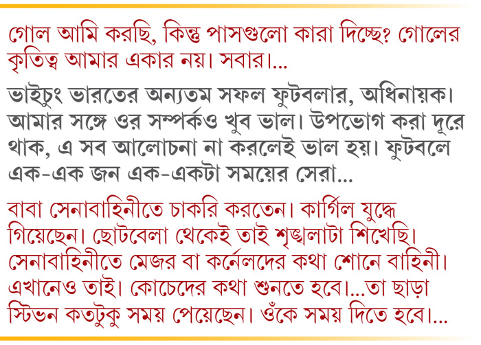 সুনীল: কেউ সেটা বলতেই পারে। আমি কিছু বলব না। ভাইচুং ভারতের অন্যতম সফল ফুটবলার, অধিনায়ক। আমার সঙ্গে ওর সম্পর্কও খুব ভাল। উপভোগ করা দূরে থাক, এ সব আলোচনা না করলেই ভাল হয়। ফুটবলে এক-এক জন এক-একটা সময়ের সেরা হয়। ও ভাবে পার্থক্য হয় না। আর আমি তো এখনও খেলছি।