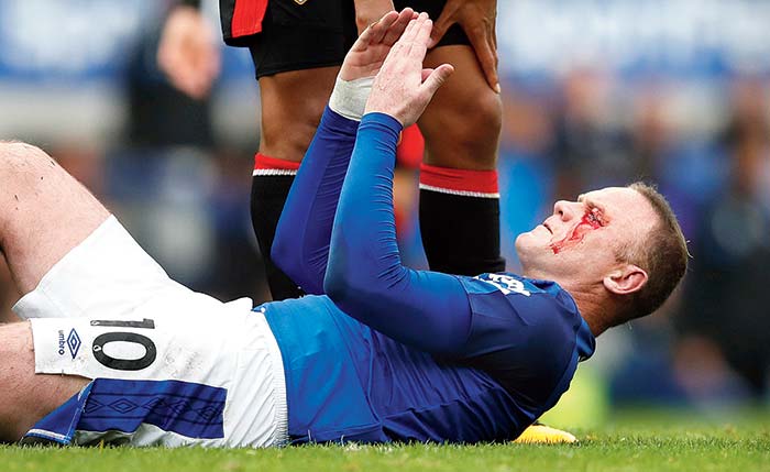 আহত: বোর্নমুথের সঙ্গে খেলায় রক্তাক্ত ওয়েন রুনি। শনিবার। ছবি: রয়টার্স।