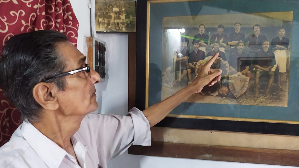 আজ মোহনবাগান দিবস। বাড়িতে অমর একাদশের ছবির সামনে নিখিল মুখোপাধ্যায়।