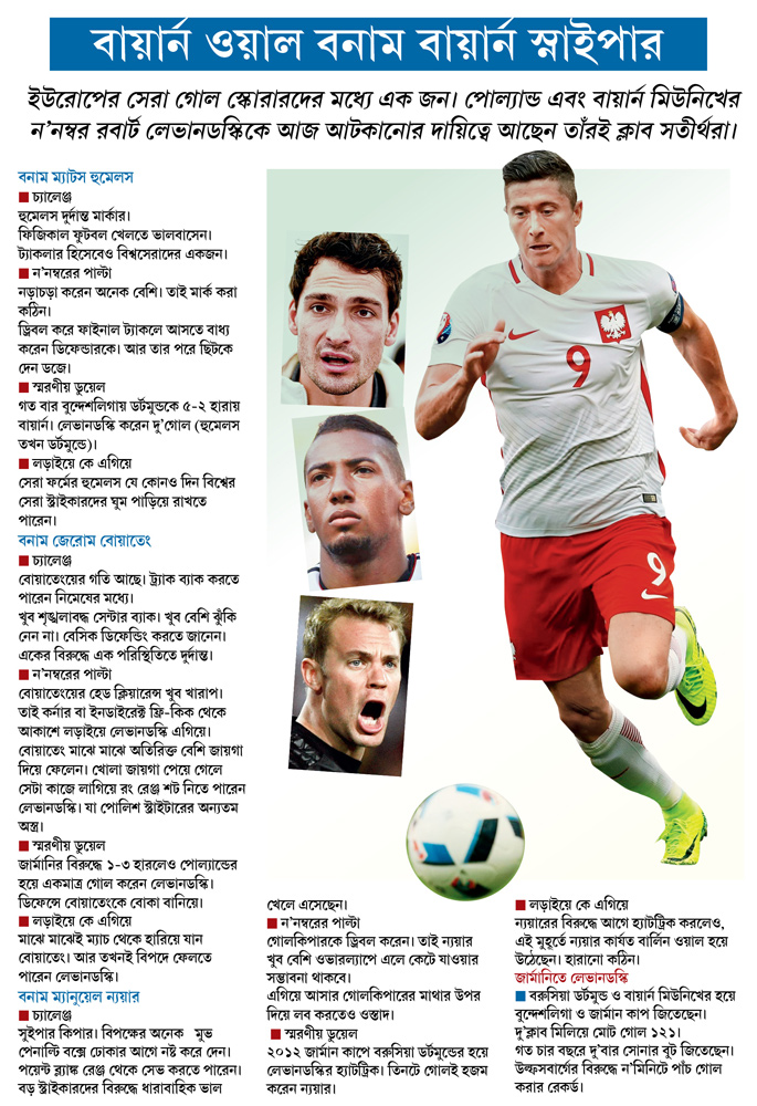 যে ম্যাচের আগে পোল্যান্ডের লেভানডস্কি বলছেন, ‘‘জার্মানি বিশ্বচ্যাম্পিয়ন সেটা জানি। একই সঙ্গে জানি যে ওরা অপ্রতিরোধ্য নয়। আর বায়ার্নে খেলার ফলে জানি কোথায় ওদের চেপে ধরতে হবে।’’ এ পর্যন্ত ইউরোতে সতেরো বার মুখোমুখি হয়েছে দু’দল। যার মধ্যে জার্মানি আট বার জিতলে পোল্যান্ডও জিতেছে চার বার। দু’দলের শেষ সাক্ষাতে গত সেপ্টেম্বরে যদিও ৩-১ জিতেছিল ন্যয়ার, মুলারদের জার্মানিই।