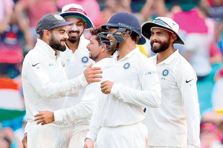সফল: হেডকে আউট করে কুলদীপ। অভিনন্দন কোহালির। ছবি: এএফপি।