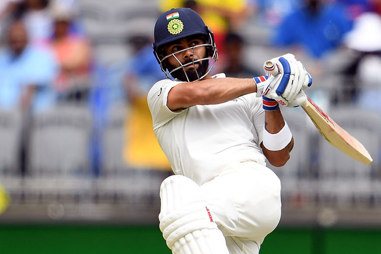 পার্থের পিচে অজিদের শাসন করে নিজের ২৫তম সেঞ্চুরি পূর্ণ করলেন বিরাট কোহালি। ছবি: এএফপি।