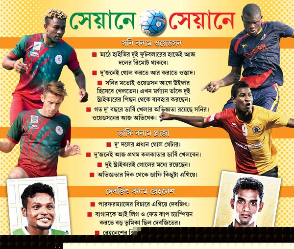 চতুর ব্রিটিশ আর চেতলার নিখাদ বঙ্গসন্তান কোচের মগজাস্ত্র-যুদ্ধে কে এগিয়ে? বলা খুব মুশকিল। তবে এটা বলা যায়, নতুন বিদেশিদের উপর ম্যাচের ফলাফল নির্ভর করছে অনেকটাই। ইস্টবেঙ্গলের বুকেনিয়া, প্লাজা বা ওয়েডসন প্রথম বার ডার্বি খেলছেন। বাগানের ডাফি আর এডুও ভারতে অন্য টিমের জার্সিতে ম্যাচ খেললেও বড় ম্যাচে নামছেন এই প্রথম। মজিদ থেকে এমেকা প্রথম ডার্বিতে ফ্লপ করেছিলেন। আবার হোসে ব্যারেটো, রডরিগে, ডু-ডং এই ম্যাচে নেমেই করেছিলেন গোল। কয়েক বছর আগে বাগান জার্সিতে জেলেনি ডার্বিতে প্রথম নেমেই চমকে দিয়েছিলেন।