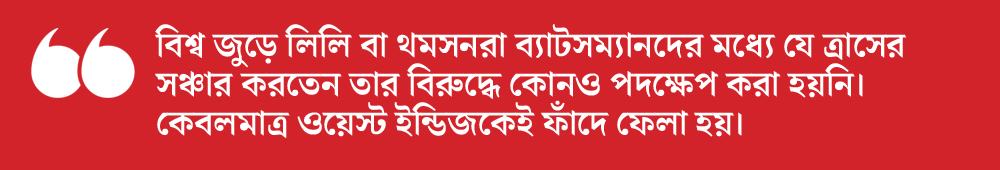 কয়েক দিন আগে ড্যারেন স্যামি বলেছিলেন, লিলি-থমসন বাউন্সার দিলে ক্ষতি নেই। কিন্তু একটা কৃষ্ণাঙ্গ দল যখনই পেস বোলিংয়ে দাপট দেখাতে শুরু করে দিল, তখনই বদলে গেল বাউন্সারের নিয়মকানুন।