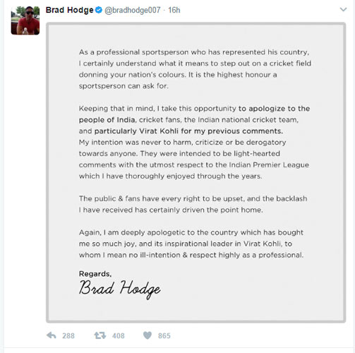 এই মুহূর্তে ভারতে তিনি। গুজরাত লায়ন্সের কোচ। বুঝতে পেড়েছেন নিজের মন্তব্য কতটা খারাপ ছিল। তাই ক্ষমা চাইতেও পিছপা হলেন না তিনি। আর ক্ষমা চাওয়ার জন্য তিনি বেছে নিলেন টুইটারকেই। ঠিক যে ভাবে বিরাট কোহালি তাঁর বক্তব্যের সপক্ষে যুক্তি দিতে বেছে নিয়েছেন টুইটারকে। তিনি টুইটারে বিরাটকে ওই মন্তব্যের জন্য ক্ষমা চেয়ে রীতিমতো চিঠি লিখে ফেলেছেন। যেখানে লেখা রয়েছে, ‘‘কাউকে আঘাত করা আমার লক্ষ্য ছিল না।’’ বিরাটের চোট নিয়ে গ্লেন ম্যাক্সওয়েলও একইরকম মন্তব্য করেছিলেন। ব্র্যাড হজ ক্ষমা চাওয়ায় মজা করে ভারতের স্পিনার রবিচন্দ্রন অশ্বিন ৩০ মার্চকে, ‘‘বিশ্ব ক্ষমা চাওয়ার দিন’ বলে ঘোষণা করেছেন।