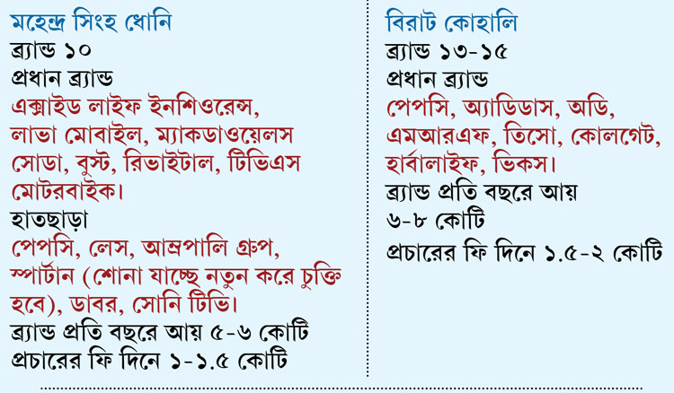 বিজ্ঞাপন-গুরু রাম রায়েরও মনে হচ্ছে যে, পেপসিকো চলে গেল বলে ধোনির ব্র্যান্ড ভ্যালু পড়ে যাবে, ভাবাটা ঠিক হবে না। ‘‘এটা একটা সিগন্যাল অবশ্যই। কিন্তু ধোনির ব্র্যান্ড ভ্যালু শেষ কোনও ভাবে বলা যাবে না। এই পরিস্থিতিতে ব্র্যান্ডরা হয়তো ওকে নিয়ে আবার নতুন করে চিন্তাভাবনা করবে। কিন্তু ব্র্যান্ড ভ্যালু শেষ হয়ে যাবে না।’’ স্পোর্টস ম্যানেজমেন্ট সংস্থা ‘বেসলাইন’-এর ডিরেক্টর রামকৃষ্ণন আবার বললেন, স্বাভাবিক কারণেই কোহালিকে ব্র্যান্ড অ্যাম্বাসাডর করেছে পেপসিকো। বললেন, ‘‘পেপসি এমন একটা ব্র্যান্ড যা সব সময় অ্যাডভেঞ্চার প্রিয় যুবসমাজকে টার্গেট করে। সচিনও কম বয়সে পেপসির বিজ্ঞাপন করেছেন। ধোনির বয়স হয়েছে। তাই স্বাভাবিকভাবেই তারা তরুণ তারকা বিরাটকে বেছে নিয়েছে।’’