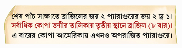 • মানো মেনেজেসের ব্রাজিল ধরেই নিয়েছিল প্যারাগুয়ে ডিফেন্সিভ খেলবে। চমকে দিয়ে তারা আক্রমণাত্মক খেলে।