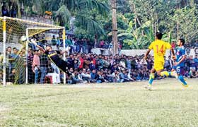 গাইঘাটার চাঁদপাড়া মিলন সঙ্ঘের পরিচালনায় আট দলের নক আউট প্রতিযোগিতায় জয়ী হল হাওড়া ইউনিয়ন। শনিবার স্থানীয় চাঁদপাড়া সঙ্ঘের মাঠে আয়োজিত ফাইনালে হাওড়া ইউনিয়ন টাইব্রেকারে ৫-৪ গোলে পরাজিত করে বাংলাদেশের গোপালগঞ্জের আবাহনী ক্রীড়া চক্রকে। খেলার নির্দিষ্ট সময়ে দু’টি দলই গোল করতে ব্যর্থ হয়। মাঠে প্রায় দেড় হাজার মানুষের ভিড় হয়েছিল। কিন্তু ফাইনাল খেলা দেখে তাদের মন ভরেনি। খেলায় প্রচুর ভুল পাস হয়। তবে খেলার দু’মিনিটের মাথায় আবাহনীর এক খেলোয়াড়ের মাঝ মাঠ থেকে নেওয়া শট হাওড়ার গোলপোস্ট ঘেঁষে বেরিয়ে যায়। কিন্তু ওইটুকুই। তারপর আবাহনী কয়েক বার আক্রমণে উঠলেও ফরওয়ার্ডদের ব্যর্থতায় গোল পায়নি। দ্বিতীয়ার্ধে আবাহনী দু’টি ও হাওড়া একটি করে কর্নার পেলেও কাজে লাগাতে পারেনি। দু’দলের একজন করে খেলোয়াড় হলুদ কার্ড দেখেন। টাইব্রেকারে আবাহনীর ইমরুল হাসানের নেওয়া শেষ শটটি বাঁচিয়ে দলকে জয়ী করেন হাওড়ার গোলকিপার পলাশ বৈদ্য। ১৫ ডিসেম্বর থেকে প্রতিযোগিতা শুরু হয়। বাকি দলগুলি ছিল সোদপুর ক্লাব, ইস্টার্ন রেল ওয়ার্কশপ, বিধাননগর মিউনিসিপ্যাল স্পোর্টস অ্যাকাডেমি, বেলঘরিয়ার আলাউদ্দিন ফুটবল একাদশ, পশ্চিমবঙ্গ পুলিশ ও খড়দহ সূর্য সেন সঙ্ঘ। ফাইনাল খেলা দেখতে উপস্থিত ছিলেন বনগাঁর এসডিপিও বিশ্বজিত্ মাহাত, গাইঘাটা থানার ওসি অরিন্দম ভট্টাচার্য, গাইঘাটা পঞ্চায়েত সমিতির সভাপতি সুব্রত সরকার।