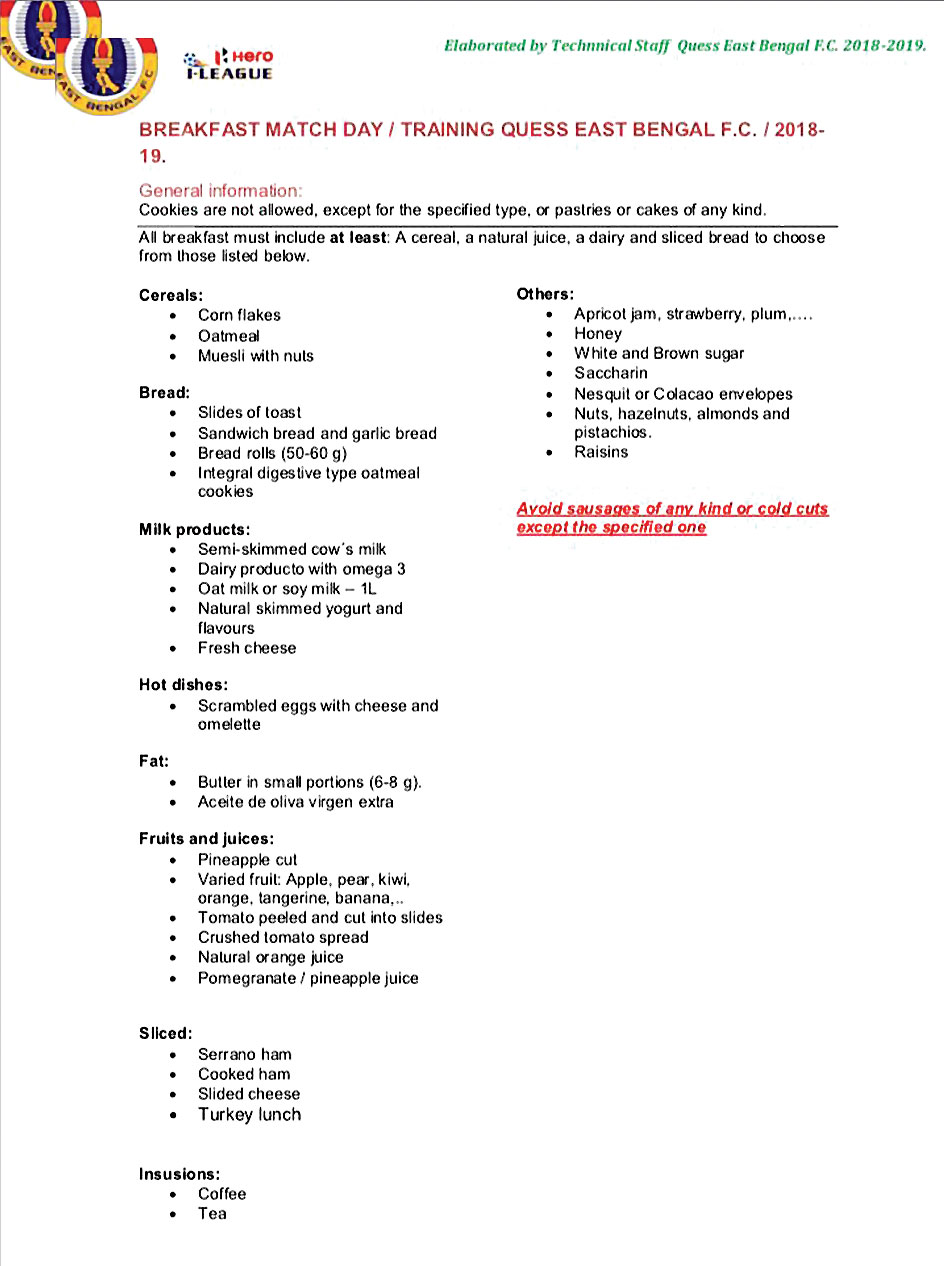 নৈশভোজের খাদ্যা তালিকায় খুব একটা পরিবর্তন নেই। তবে স্পষ্ট করে দেওয়া হয়েছে, কোনও ফুটবলারই দু’টোর বেশি ডিম খেতে পারবেন না। বেকন, সসেজ, ঠান্ডা মাংস ও টোম্যাটো কেচাপ খাওয়া চলবে না। পান করতে হবে প্রচুর পরিমাণে জল।