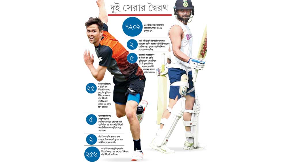 • ভারত অধিনায়কের প্রধান চ্যালেঞ্জ অফস্টাম্প থেকে বেরিয়ে যাওয়া আউটসুইং বল। ইংল্যান্ডে অ্যান্ডারসন যে কারণে আতঙ্ক ছিলেন। শেষ ইংল্যান্ড সফরে সেই ত্রুটিও সারিয়ে ফেলেন তিনি। বোল্ট যদি আউটসুইং মেশাতে না পারেন, বিরাটকে সমস্যায় ফেলা কঠিন হবে।