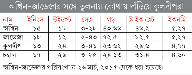 অশ্বিনদের সঙ্গে তুলনায় কুলদীপরা কোথায় থাকছেন: শ্রীলঙ্কাতে পরীক্ষামূলক ভাবে চহাল এবং কুলদীপকে নিয়ে আসার পর থেকে সোনার দৌড় চলছে তাঁদের। অশ্বিনের প্রত্যেক উইকেট নিতে লাগছিল ৪৬ বল। জাডেজার লাগছিল ৮২ বল। সেই তুলনায় কুলদীপের লাগছে ২৯ বল। চহালের লাগছে ৩১ বল। ২০১৫ বিশ্বকাপের পর থেকে অশ্বিন ওভার প্রতি রান দিচ্ছিলেন ৫.২৭ করে। জাডেজাও তাই। আর কুলদীপ দিচ্ছেন ওভার প্রতি ৪.৭৭ রান। চহাল দিচ্ছেন ৪.৬০ রান। চহাল লেগস্পিনার। কুলদীপ বাঁ হাতি চায়নাম্যান। দুর্দান্ত বৈচিত্র এবং রহস্যের জালে তাঁরা সব ধরনের পরিবেশে, সমস্ত প্রতিপক্ষকে নাজেহাল করে ছাড়ছেন। বৃহস্পতিবার দক্ষিণ আফ্রিকাকেও মাঝের ওভারগুলোতে চাপে ফেলে দিলেন এই দু’জন। অশ্বিন-জাডেজার চেয়ে উইকেট নেওয়ার ব্যাপারেও অনেক এগিয়ে কুলদীপ-রা। ২০১৫ বিশ্বকাপ থেকে পরের দু’বছরে ১৫ ইনিংসে অশ্বিন নিয়েছেন ১৮ উইকেট। জাডেজা ১৮ ইনিংসে নিয়েছেন ১২ উইকেট। আর কুলদীপ ১৩ ইনিংসে পেয়েছেন ২৪ উইকেট। চহাল ১৭ ইনিংসে পেয়েছেন ২৯ উইকেট। বৃহস্পতিবার ডারবানেও দক্ষিণ আফ্রিকার আটটি উইকেটের মধ্যে পাঁচটি নিয়েছেন তাঁরা।