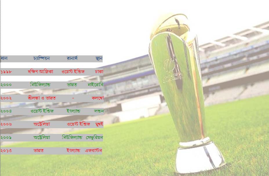 আবার একটা চ্যাম্পিয়ন্স ট্রফি। আবার বিশ্ব ক্রিকেটের হাড্ডাহাড্ডি লড়াই। বিরাট কোহালি তো বলেই দিয়েছেন বিশ্বকাপের থেকেও অনেক বেশি কঠিন চ্যাম্পিয়ন্স ট্রফি। ইতিমধ্যেই সাতটি চ্যাম্পিয়ন্স ট্রফি দেখে ফেলেছে বিশ্ব ক্রিকেট। হাতে মাত্র ছ’দিন। তার পরই ইংল্যান্ডে শুরু হয়ে যাচ্ছে আট দেশের এক কথায় বিশ্ব জয়ের লড়াই। সদ্য আইপিএল খেলে ফিরেছে অনেকেই। সেই স্মৃতিকে পিছনে ফেলে এখন দেশের জন্য লড়তে তৈরি বিরাট কোহালি থেকে ধোনি সকলেই। এক ঝলকে দেখে নেওয়া যাক গত সাতবারের চ্যাম্পিয়নদের।