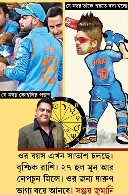 সংখ্যাতত্ত্ববিদ সঞ্জয় জুমানি অবশ্য মনে করেন সমাধান কোহলির সামনেই পড়ে রয়েছে। সেটা পাকিস্তান ম্যাচের আগেই সম্ভব। শুধু কোহলিকে ফর্মে ফিরতে হলে জার্সি নম্বর বদলাতে হবে। আফগান ম্যাচে কোহলি আউট হয়ে যাওয়ার পর মুম্বই থেকে ফোনে জুমানি বললেন, “ওর পক্ষে ১৮ নম্বরটা ভুল নির্বাচন। ১ হল রবি। আর ৮ মানে শনি। এদের কম্বিনেশন কখনও ভাল নয়। শ্রীনগর, শ্রীলঙ্কা এগুলো সংখ্যাতত্ত্বের বিচারে যোগ করলে ১৮ হয়। মানে ধ্বংসাত্মক কিছু যে কোনও সময় ঘটতে পারে।”