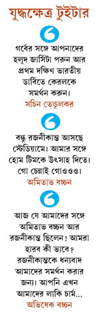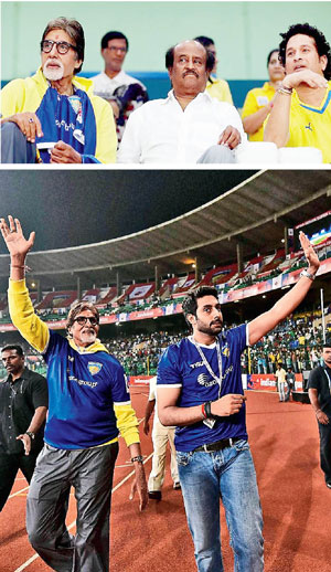 তখনও ম্যাচ চলছে। রজনীকান্তের সঙ্গে চেন্নাইয়ের অমিতাভ এবং কেরলের সচিন।