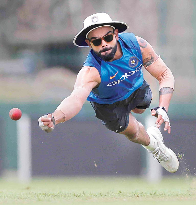 উড়ন্ত: কলম্বোর এসএসসি-তে ভারতীয় অনুশীলনে মরিয়া বিরাট কোহালি। মঙ্গলবার। সিরিজে ১-০ এগিয়ে ভারত। দ্বিতীয় টেস্ট শুরু বৃহস্পতিবার থেকে। এপি