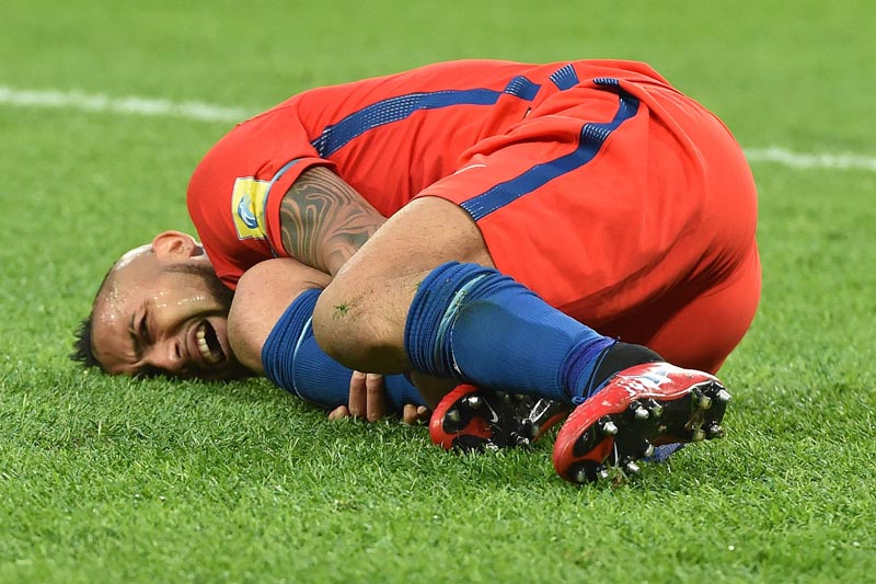 চোট পেয়ে মাঠে পড়ে রয়েছেন ভিদাল। ছবি: এএফপি।