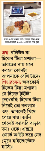 পিটারসেন: অফকোর্স চিকেন টিক্কা মশালা। সে দিনের টুইটটা দেখেননি! চিকেন টিক্কা নিয়েই তো করলাম। ওফ্, ভাবলেই খিদে পেয়ে যায়। জানি খেলেই ক্যালরি বাড়ার ভয়। ওকে। এক্সট্রা ওয়ার্ক আউট করে নেব (মুখে হাইভোল্টেজ হাসি)।