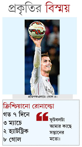 এ জন্যই হয়তো বের্নাবাওয়ে মাঝে মাঝেই এ দিন ‘ক্রিশ্চিয়ানো ব্যালন ডি’অর’ চিৎকারটা ভেসে উঠছিল। যেন এ বছরের বিশ্বসেরা ফুটবলার কে হবেন, সেটা মরসুম শুরু হতে না হতেই ঠিক হয়ে গিয়েছে দর্শকদের চোখে। এমনও বলা হচ্ছে প্রত্যেকটা গোলের সঙ্গে সঙ্গে বের্নাবাওয়ের বাইরে নিজের পাথরের মূর্তি বসাটা আরও নিশ্চিত করে দিচ্ছেন রোনাল্ডো। কেন না যে গতিতে তিনি এগোচ্ছেন তাতে রিয়ালের ইতিহাসে সর্বোচ্চ গোলদাতা রাউলকে ধরে ফেলাটা শুধু সময়ের অপেক্ষা। ২৫৪ ম্যাচে লস ব্লাঙ্কোস জার্সিতে ২৬৪ গোল করে ফেলেছেন রোনাল্ডো। রাউলের রেকর্ড ৩২৩ গোল। তবে সেটা আসে ১৫টা মরসুমে ৭৪১ ম্যাচে।
