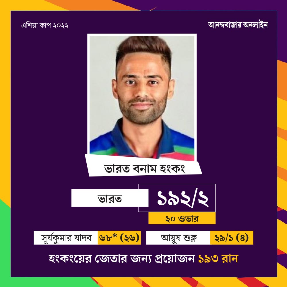 ২০ ওভারে ২ উইকেট হারিয়ে ১৯২ রান করল ভারত। কোহলী ৫৯ ও সূর্য ৬৮ রান করে অপরাজিত থাকলেন।