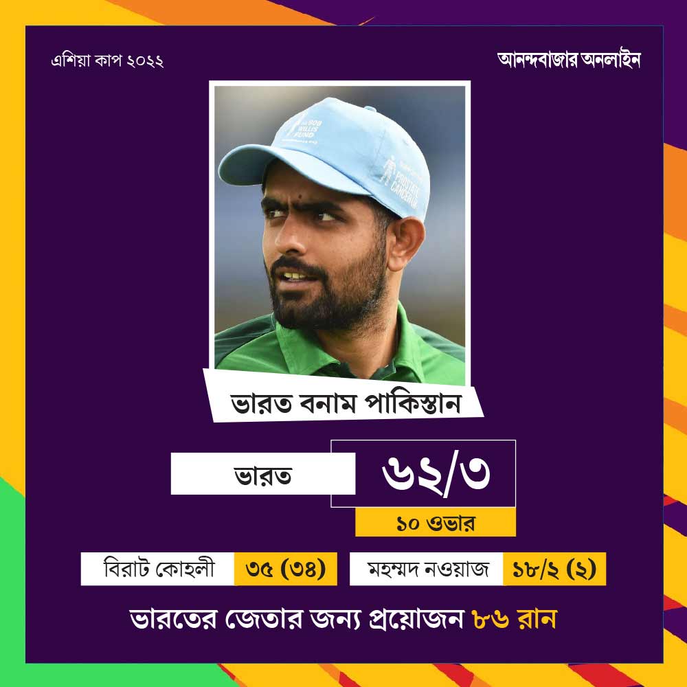 ১০ ওভার শেষে ভারতের স্কোর ৬২/৩। জয়ের জন্য এখনও প্রয়োজন ৮৬ রান।