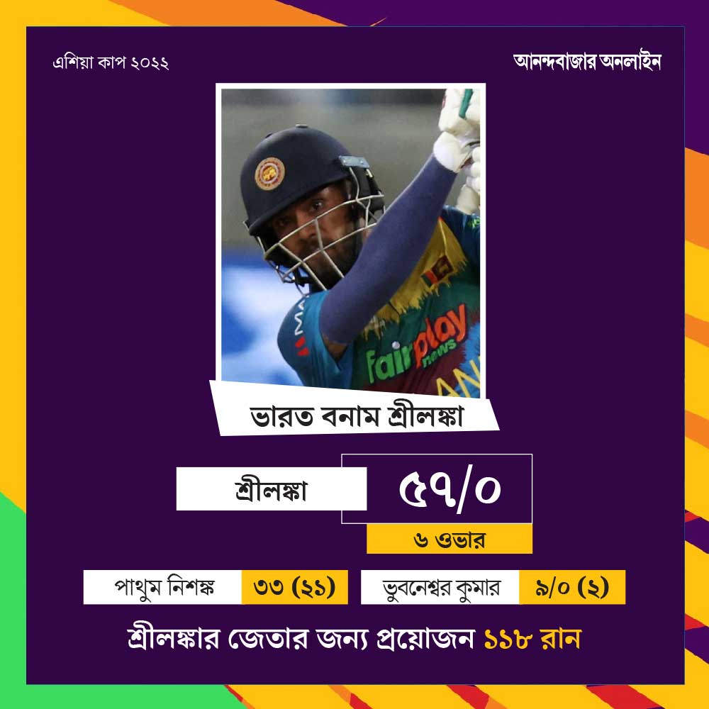 ৬ ওভার শেষ। নিশঙ্ক (৩৩) এবং মেন্ডিস (২৪) ব্যাট করছেন।