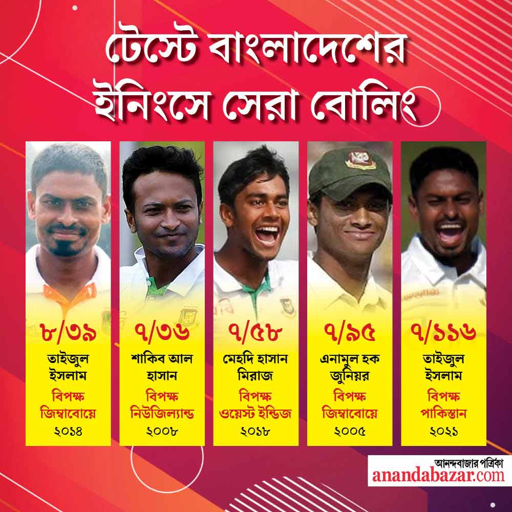 বাংলাদেশের হয়ে এর আগে ইনিংসে ৭ উইকেট নিয়েছেন শাকিব আল হাসান (৭/৩৬, বিপক্ষ নিউজিল্যান্ড, ২০০৮), মেহদি হাসান মিরাজ (৭/৫৮, বিপক্ষ ওয়েস্ট ইন্ডিজ, ২০১৮), এনামুল হক জুনিয়র (৭/৯৫, বিপক্ষ পাকিস্তান, ২০০৫)।