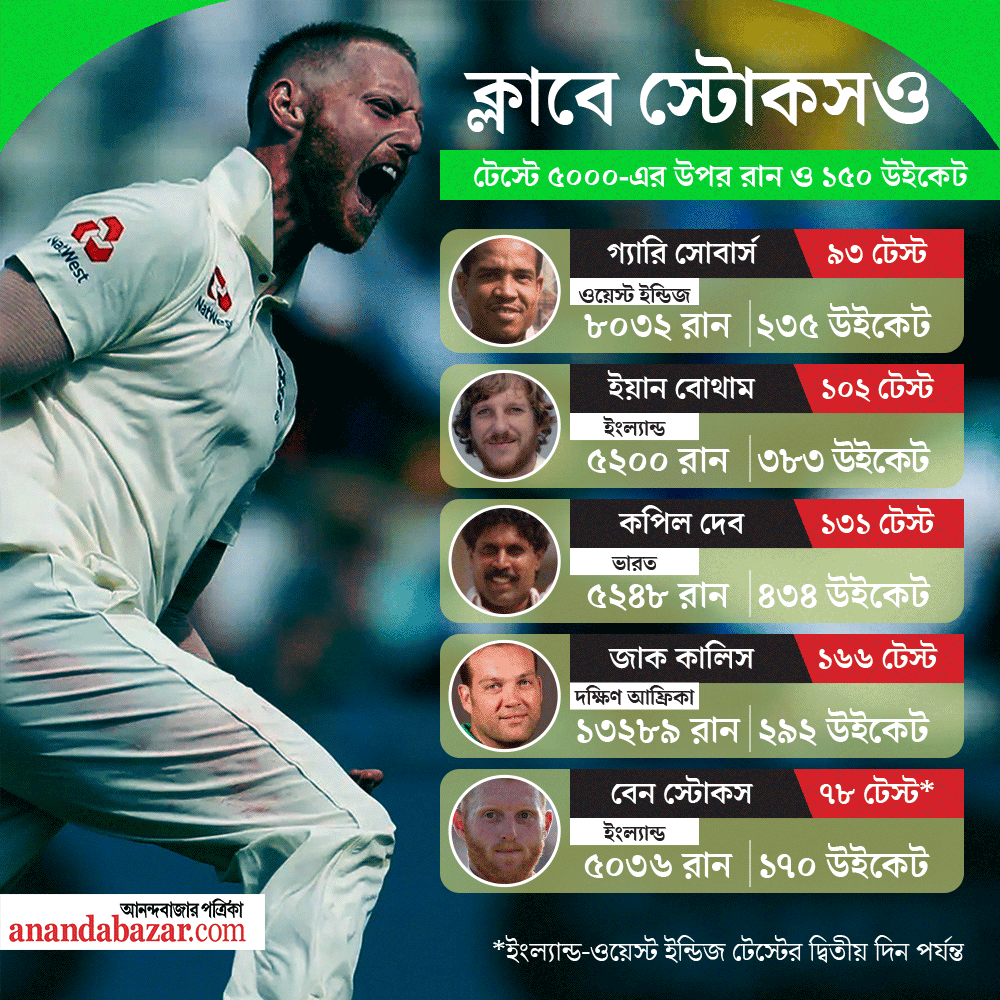 টেস্টে ৫০০০ রান ও ১৫০ উইকেট নেওয়া অলরাউন্ডারদের তালিকায় যাঁরা রয়েছেন তাঁদের মধ্যে অন্যতম দক্ষিণ আফ্রিকার জ্যাক কালিস। ১৬৬ টেস্টে তাঁর রান ১৩২৮৯। উইকেটের সংখ্যা ১৬৬। বাকিদের মধ্যে গ্যারি সোবার্সের রান ৯৩ টেস্টে ৮০৩২। উইকেট নিয়েছেন ২৩৫টি। কপিল দেব ১৩১ টেস্টে ৫২৪৮ রান ও ৪৩৪ উইকেট নিয়েছেন। নিউজিল্যান্ডের ইয়ান বোথামের ১০২ টেস্টে ৫২০০ রান ও ৩৮৩ উইকেট রয়েছে। ৭৮ টেস্টে স্টোকসের রান ৫০২১। ১৭০টি উইকেট নিয়েছেন তিনি।