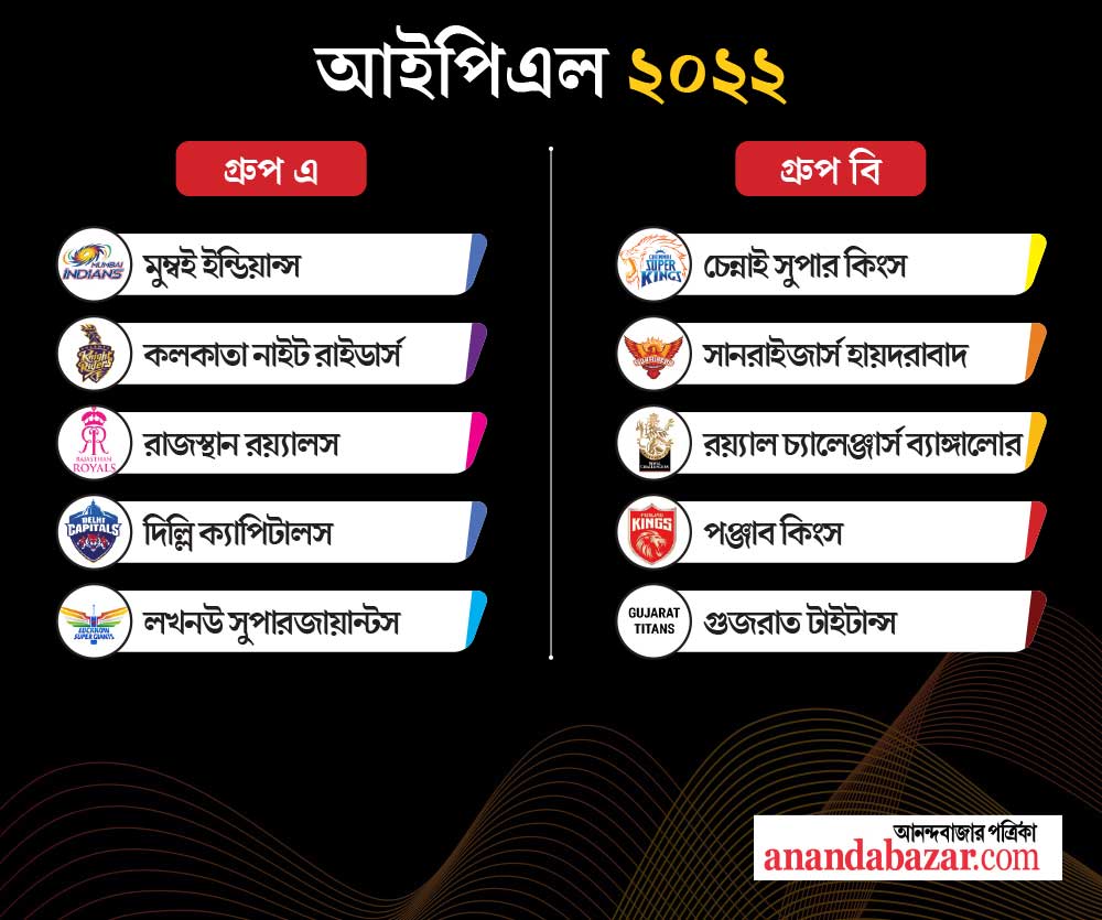 কলকাতা নাইট রাইডার্সের গ্রুপে রয়েছে মুম্বই ইন্ডিয়ান্স, দিল্লি ক্যাপিটালস, রাজস্থান রয়্যালস এবং লখনউ সুপারজায়ান্টস। অন্য গ্রুপে রয়েছে চেন্নাই সুপার কিংস, গুজরাত টাইটান্স, সানরাইজার্স হায়দরাবাদ, পঞ্জাব কিংস এবং রয়্যাল চ্যালেঞ্জার্স ব্যাঙ্গালোর। প্রতিটি দল নিজেদের গ্রুপের বাকি চার দলের সঙ্গে দু’টি ম্যাচ খেলবে এবং অন্য গ্রুপে তাঁর রো-তে থাকা দলের বিরুদ্ধে দু’টি ম্যাচ খেলবে। বাকি চার দলের সঙ্গে একটি করে ম্যাচ খেলবে।