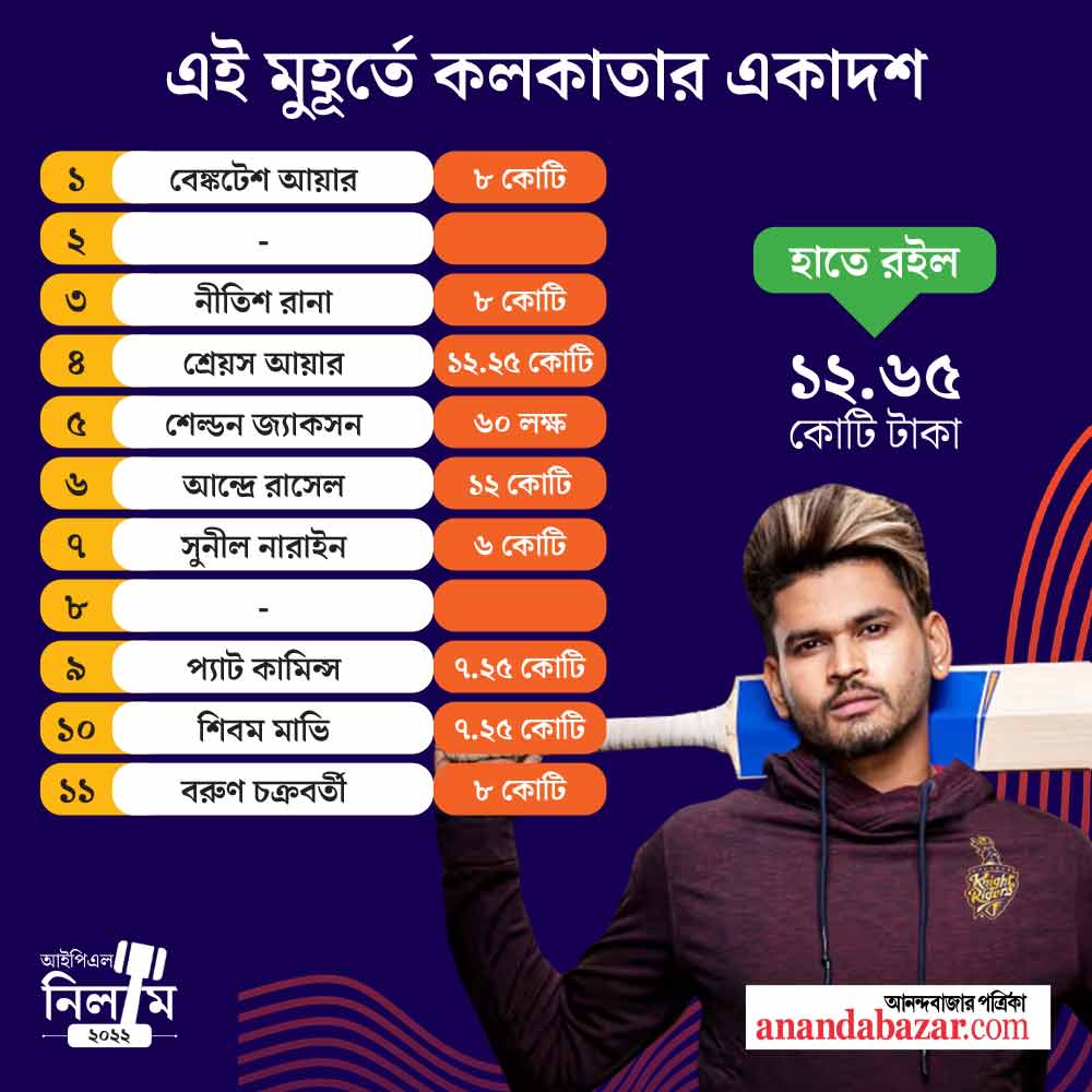 শনিবারের নিলাম শেষে কলকাতার ঘরে রয়েছে ন’জন ক্রিকেটার। এর মধ্যে আন্দ্রে রাসেল, সুনীল নারাইন, বরুণ চক্রবর্তী এবং বেঙ্কটেশ আয়ারকে রেখে দিয়েছিল তারা। ওপেনার হিসাবে বেঙ্কটেশ থাকলেও দ্বিতীয় ওপেনার কে হবেন তা এখনও পরিষ্কার নয়। নীতিশ রানাকে ৮ কোটি টাকা দিয়ে নিয়েছে কেকেআর। তিন নম্বরে খেলতে পারেন তিনি। প্রয়োজনে ওপেনও করতে পারবেন। চার নম্বরে শ্রেয়স থাকছেন। তাঁর দাম ১২ কোটি ২৫ লক্ষ।