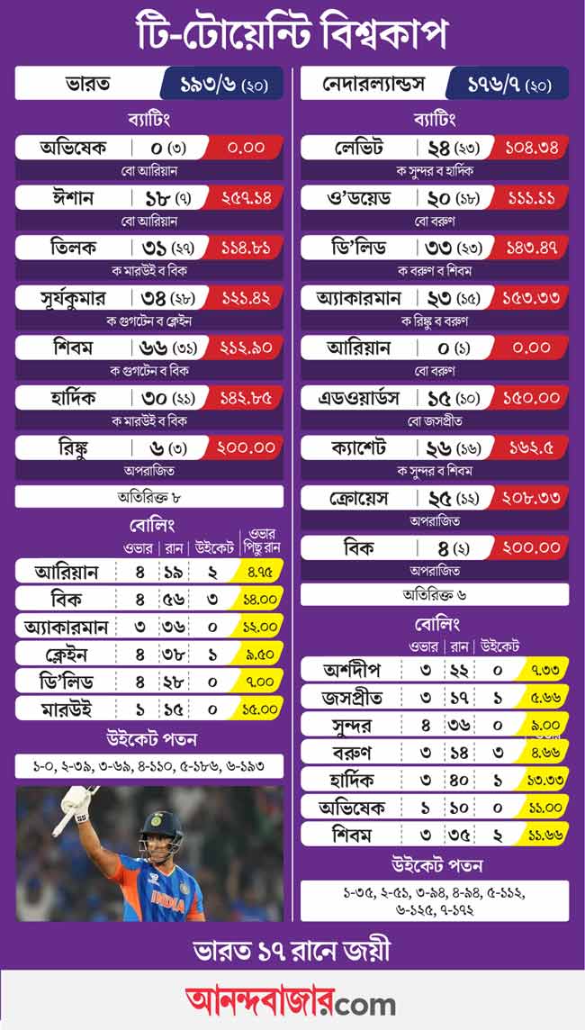 ভারতের ইনিংসকে ভাল জায়গায় পৌঁছে দিলেন মূলত শিবম দুবে। বিশ্বকাপে ফর্মে রয়েছেন মুম্বইয়ের অলরাউন্ডার। নেদারল্যান্ডসের বিরুদ্ধে খেললেন ৩১ বলে ৬৬ রানের ইনিংস। তাঁর ব্যাট থেকে এল ৪টি চার এবং ৬টি ছক্কা। কিছুটা আগ্রাসী ব্যাটিংয়ের চেষ্টা করলেন হার্দিক পাণ্ড্যও। তাঁর ২১ বলে ৩০ রানের ইনিংসে রয়েছে ৩টি ছয়। ৩ বলে ৬ রান করে অপরাজিত থাকেন রিঙ্কু সিংহ।