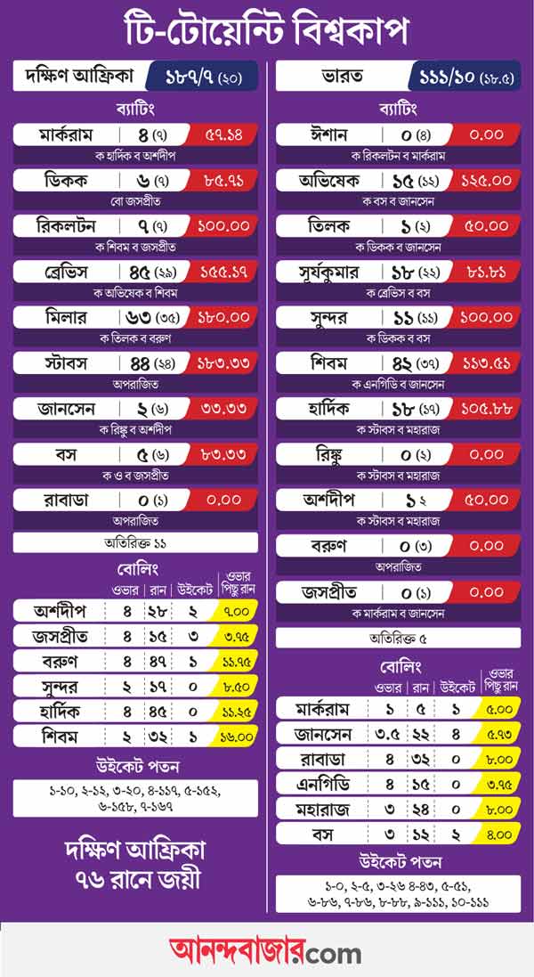 ভারত-দক্ষিণ আফ্রিকা ম্যাচে বার বার বদলাল রং। কখনও সূর্যকুমার যাদবদের দাপট। আবার কখনও এডেন মার্করামদের। শুরুটা ছিল ভারতের। তবে দিনের শুরুটা যে সব সময় দিনের বাকিটার ইঙ্গিত দেয় না, তা প্রমাণ করে দিল রবিবারের ম্যাচ। দক্ষিণ আফ্রিকার ৭ উইকেটে ১৮৭ রানের জবাবে ভারতের ইনিংস শেষ হল ১৮.৫ ওভারে ১১১ রানে। জয় শাহের ঘরের মাঠে সূর্যেরা হারলেন ৭৬ রানে। প্রতিযোগিতার প্রথম কঠিন প্রতিপক্ষের সামনেই বেরিয়ে পড়ল ভারতীয় ব্যাটিংয়ের কঙ্কাল। ২০২৩ সালে এক দিনের বিশ্বকাপ ফাইনালের পর আবার আইসিসি প্রতিযোগিতায় কোনও ম্যাচ হারল ভারত। সেই নরেন্দ্র মোদী স্টেডিয়ামেই!