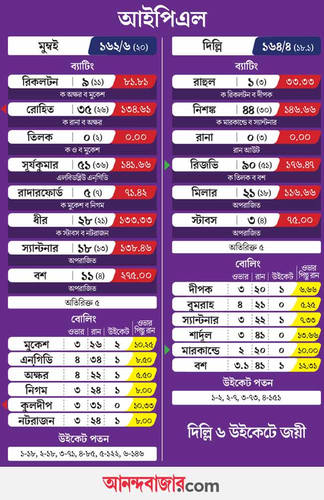 সেখান থেকে হাল ধরেন রোহিত এবং সূর্যকুমার। তৃতীয় উইকেটে ৫৩ রানের জুটি গড়েন তাঁরা। রোহিত বেশ আগ্রাসী খেলছিলেন। ধীরে ধীরে অর্ধশতরানের দিকে এগিয়ে যাচ্ছিলেন। ২৬ বলে ৩৫ রান করে ফিরে যান তিনি। মারেন পাঁচটি চার এবং একটি ছয়। শেরফানে রাদারফোর্ডও টিকতে পারেননি। তিনি ৭ বলে ৫ রান করেন। সূর্যকুমারের সঙ্গে যোগ দেন নমন ধীর। একটা দিক রেখেছিলেন সূর্যকুমার। তিনি চালিয়ে খেলে তিনটি চার এবং দুটি ছয়ের সাহায্যে ৩৬ বলে ৫১ করেন। নমন করেন ২১ বলে ২৮। দিল্লির হয়ে মুকেশ দু’টি উইকেট নেওয়া ছাড়াও একটি করে উইকেট পেয়েছেন লুনগি এনগিডি, অক্ষর পটেল, বিপরাজ নিগম এবং টি নটরাজন।