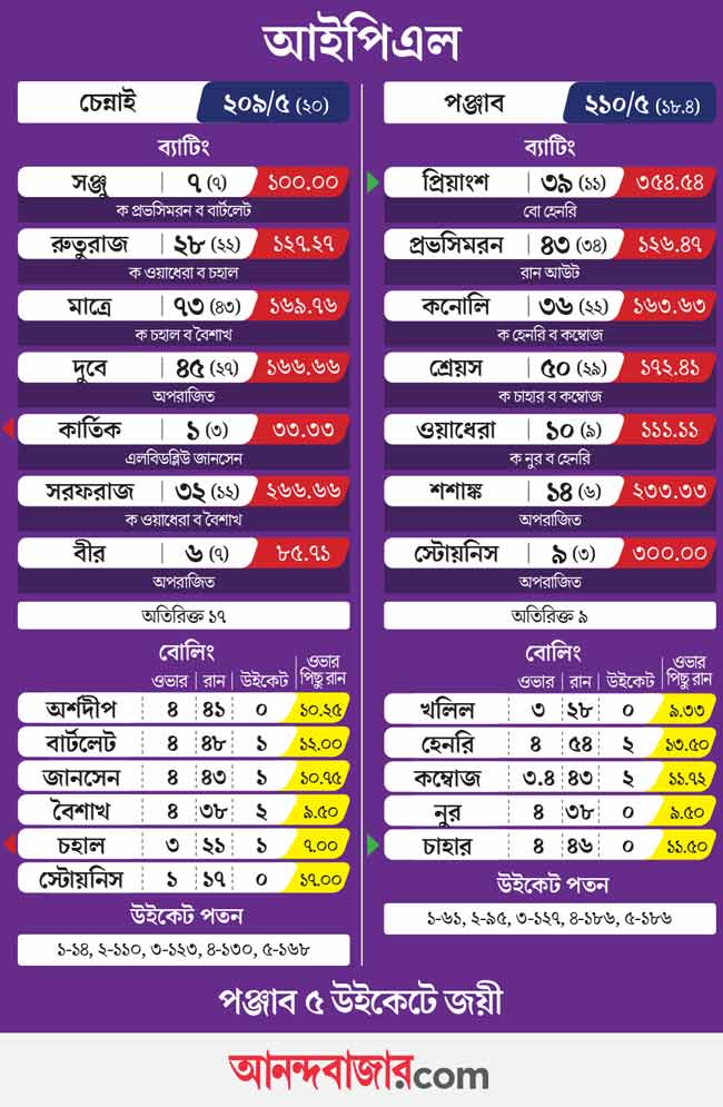 আইপিএলে কলকাতা দু’টি ম্যাচেই ভুগেছে বোলিংয়ের জন্য। চেন্নাইয়েরও একই অবস্থা দেখা গেল শুক্রবার। প্রথম ম্যাচে ব্যাটারদের দোষে হারলে, দ্বিতীয় ম্যাচে দায়ী বোলারেরা। খলিল আহমেদ, অংশুল কম্বোজ, নূর আহমেদরা ছাপই ফেলতে পারলেন না। ম্যাট হেনরি দু’টি উইকেট নিলেও প্রচুর রান খরচ করলেন। ব্যাটিংয়েও শুরুটা যে ভাবে হয়েছিল তাতে আরও একটু বেশি রান তোলা উচিত ছিল চেন্নাইয়ের। পঞ্জাব আগের ম্যাচে হারতে হারতে জিতেছিল কুপার কনোলির সৌজন্যে। এ দিন দলের জয়ে অবদান রাখলেন সকলেই।